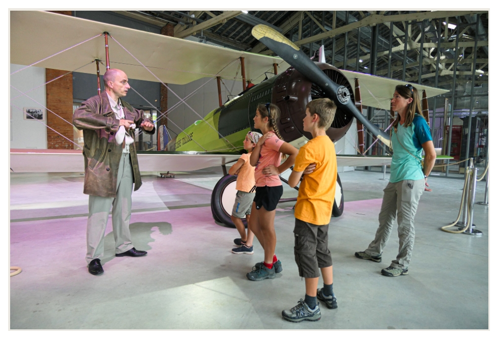 Deux semaines après notre départ, notre première rencontre se fait au musée « l’envol des pionniers » à Toulouse Montaudran. Découvrir la légende de l’Aéropostale, de ces pilotes qui ont bravé les tempêtes et leurs peurs pour transporter le précieux courrier. Les enfants sont passionnés par cet aviateur de 1927, qui leur conte les péripéties de la ligne Toulouse-Dakar. Nous entrons dans la légende des pionniers de l’aviation : Mermoz, Guillaumet, et bien sûr, Saint-Exupéry. Et forcément, quand les petits princes à vélo rencontrent un aviateur, ils lui demandent : « S’il te plaît, dessine-moi un mouton ».
