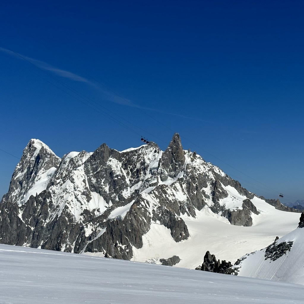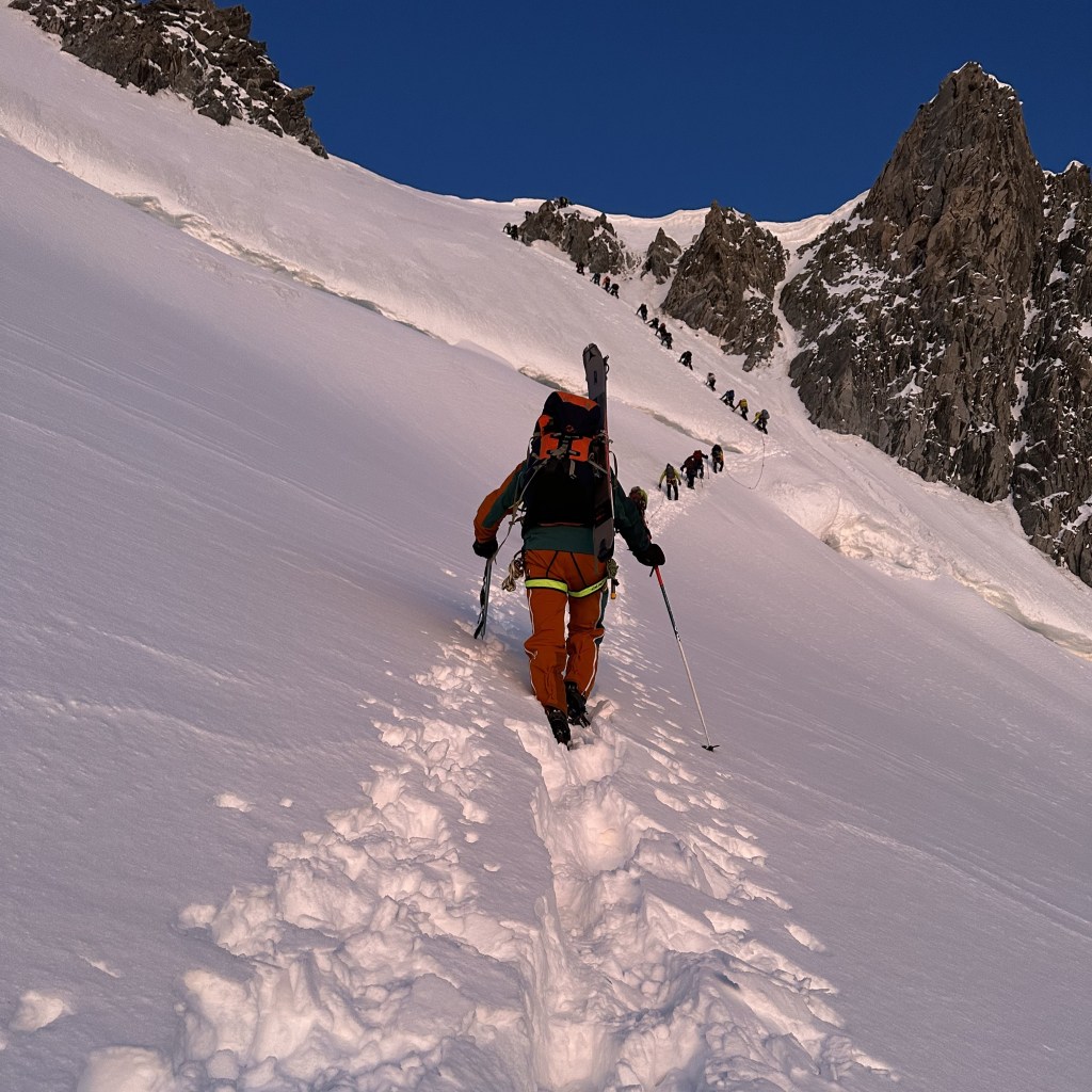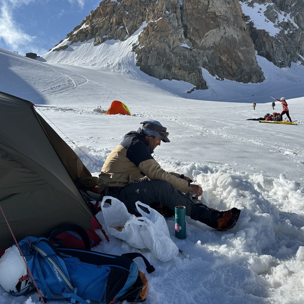 Montée express à 3800 mètres via le téléphérique de l’Aiguille du midi. Neige fraiche et grand soleil ravissent les grimpeurs de tous poils. Les refuges sont pleins à craquer. Nous dressons le bivouac directement sur le glacier parmi de nombreuses autres tentes. Petits parcours d’arêtes sur l’excellent granite ocre des Cosmiques, histoire de s’acclimater un peu et de se mettre en jambe.