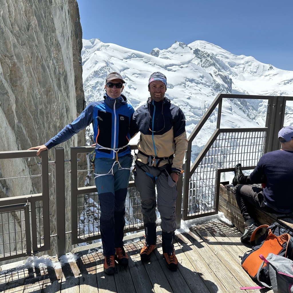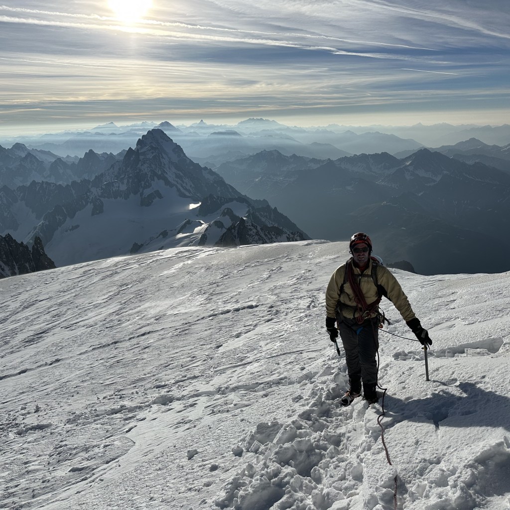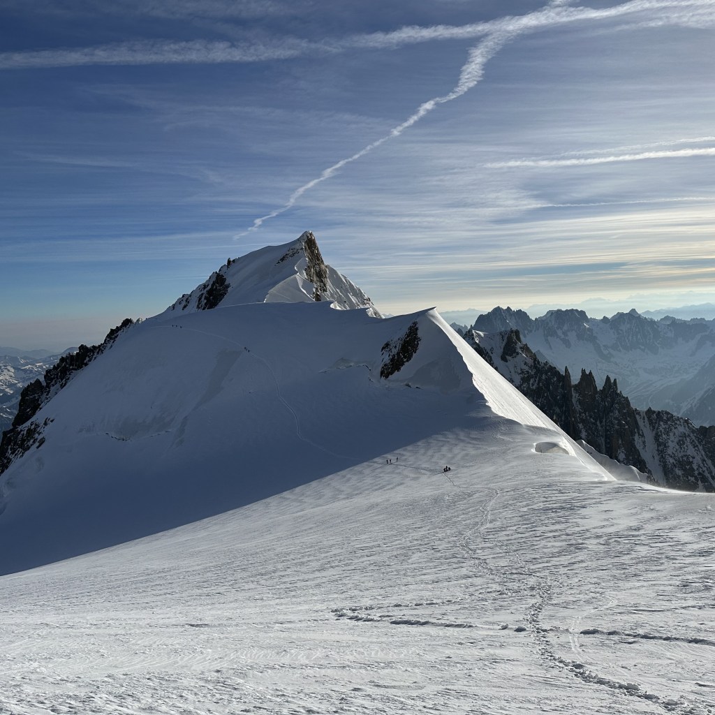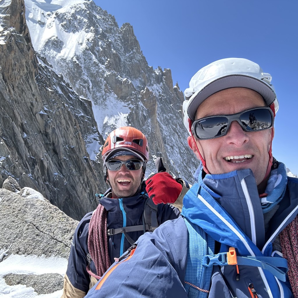 Montée express à 3800 mètres via le téléphérique de l’Aiguille du midi. Neige fraiche et grand soleil ravissent les grimpeurs de tous poils. Les refuges sont pleins à craquer. Nous dressons le bivouac directement sur le glacier parmi de nombreuses autres tentes. Petits parcours d’arêtes sur l’excellent granite ocre des Cosmiques, histoire de s’acclimater un peu et de se mettre en jambe.