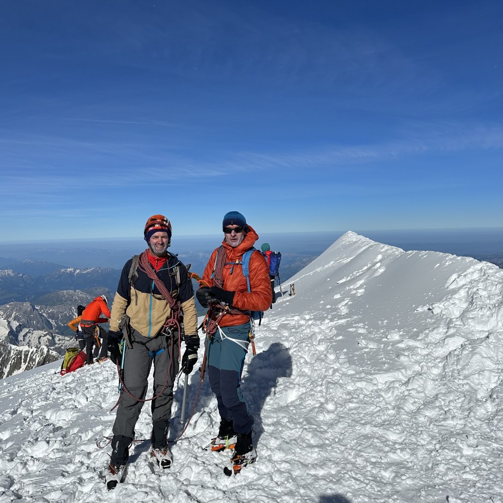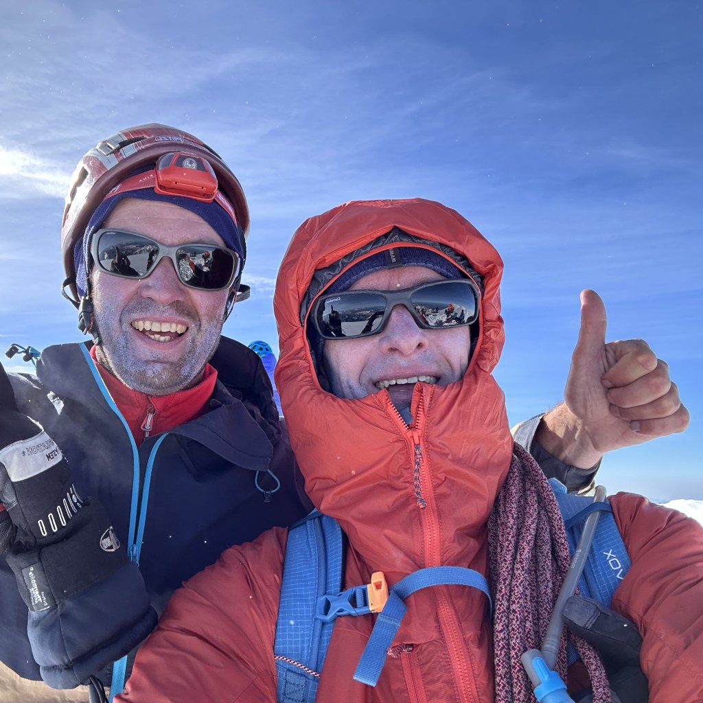 De violentes bourrasques balaient la croupe de glace puis… plus rien. Nous venons de basculer sur le versant sud-ouest, gagnant instantanément pas loin de 10°C. Nous voici tout en haut, au comble du bonheur. Je serre mon frangin dans les bras comme je l’avais fait 25 ans plus tôt avec mes parents. Une larme perle sur mes paupières et je n’ai même plus l’excuse du froid ou du vent pour cacher mon émotion.