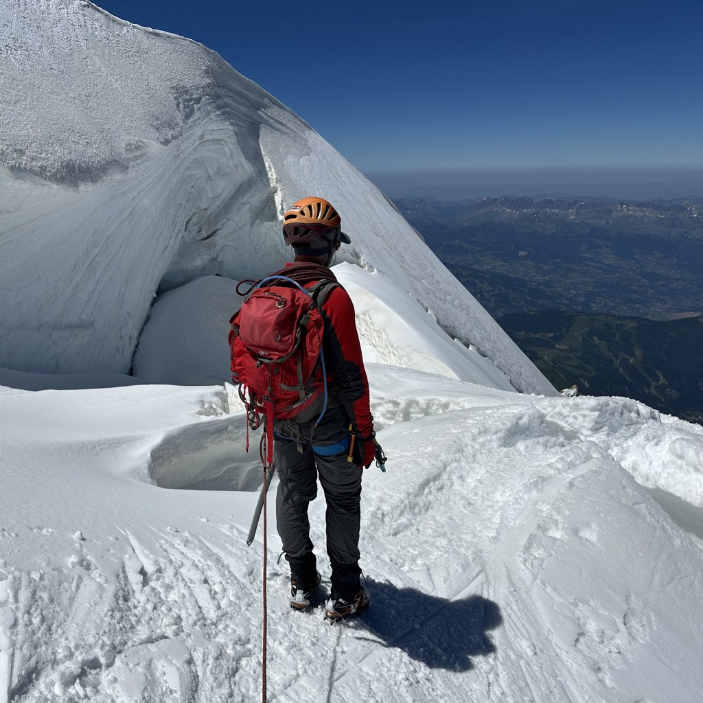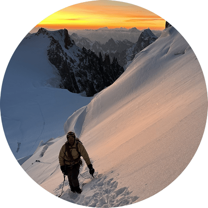 Après une nuit de somnolence, c’est aux lueurs des lampes frontales que se gravit l’imposante face glacière du Mont Blanc du Tacul et ses 4248 mètres. Dans l’immense diagonale qui s’élève en direction du col du Maudit, l’aube enflamme les cimes de couleurs rosées, orangées, poussant parfois jusqu’au violet. Pas question pour autant de se déconcentrer dans cette pente de glace verticale où la progression se fait du bout des crampons en s’arcboutant sur deux piolets-tractions. Le ressaut franchi, notre cordée quitte la trace principale pour rejoindre les cîmes terminales du Mont Maudit. Un terrible nom qui nous vaudra un pied profondément enseveli dans une crevasse, mais heureusement guère plus.