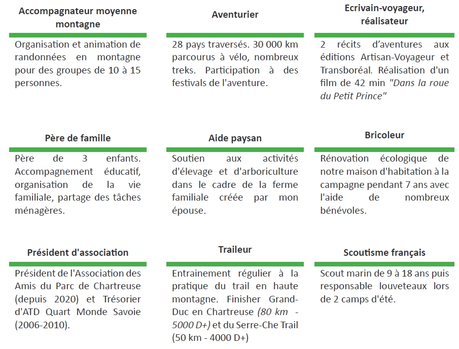 Après des études d’ingénieurs en agriculture et une spécialisation en développement international, il entreprend un premier grand voyage à vélo en couple, de Chambéry au Cap de Bonne Espérance à la rencontre de trente projets solidaires.